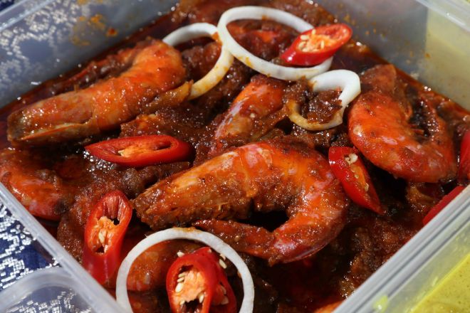 Nasi empit, sayur lemak lodeh, serunding, ayam masak merah, daging rendang, sambal tumis udang.